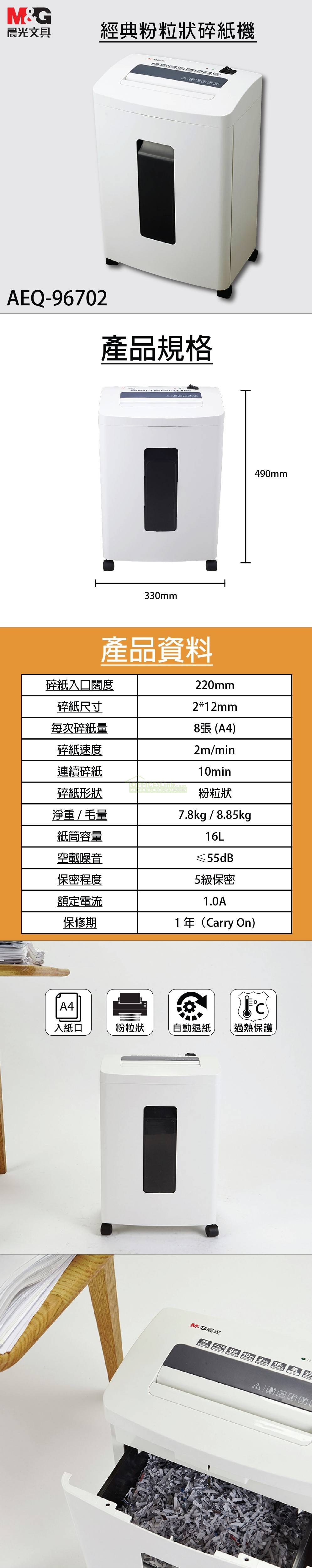 商品名稱:M&G 晨光文具 AEQ-96702 - 2 × 12mm 經典粉粒狀碎紙機【8張紙】 商品編號:OL009841 品牌:M&G晨光 上架時間:2020-08-24 商品淨重:0克